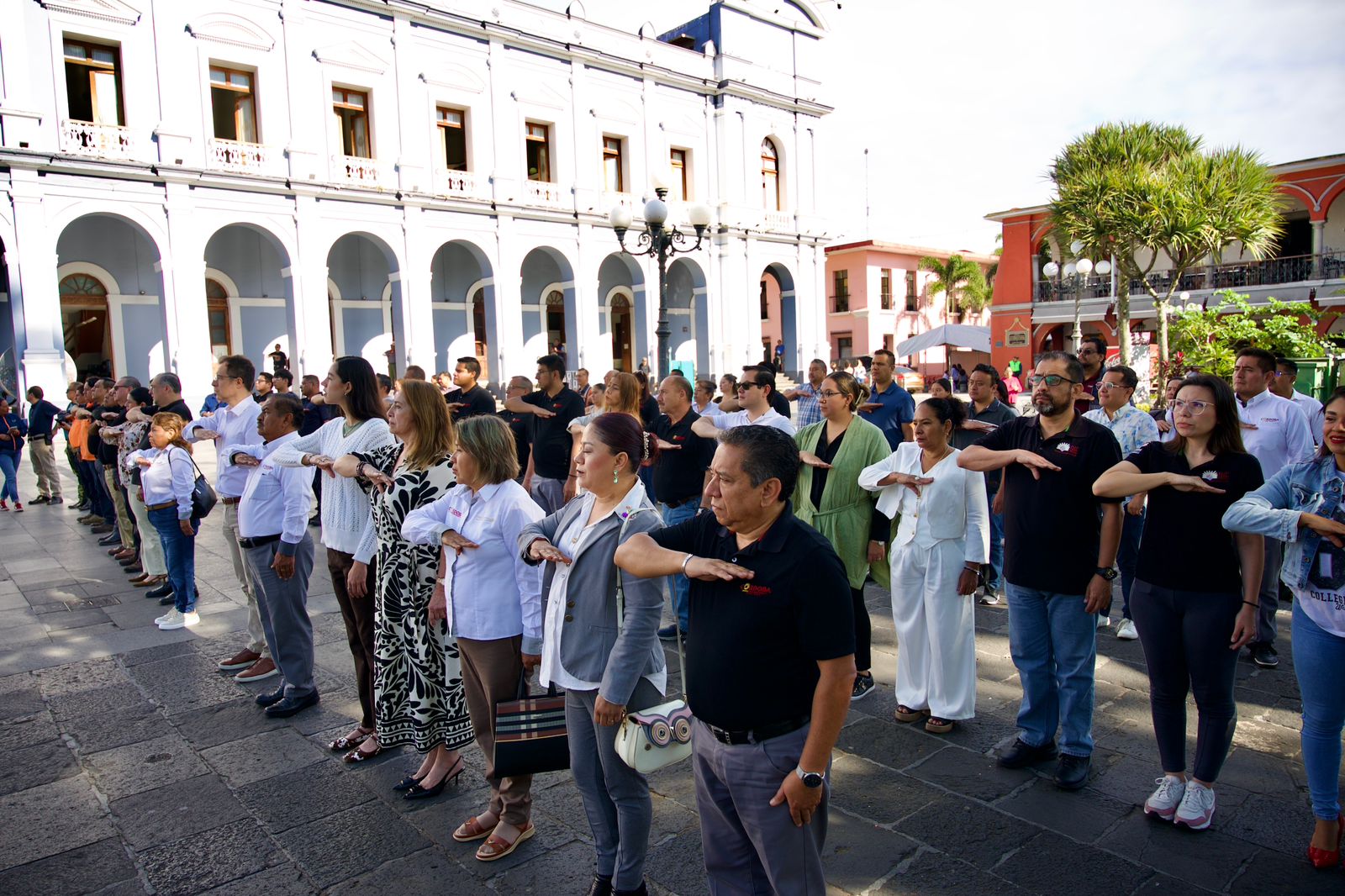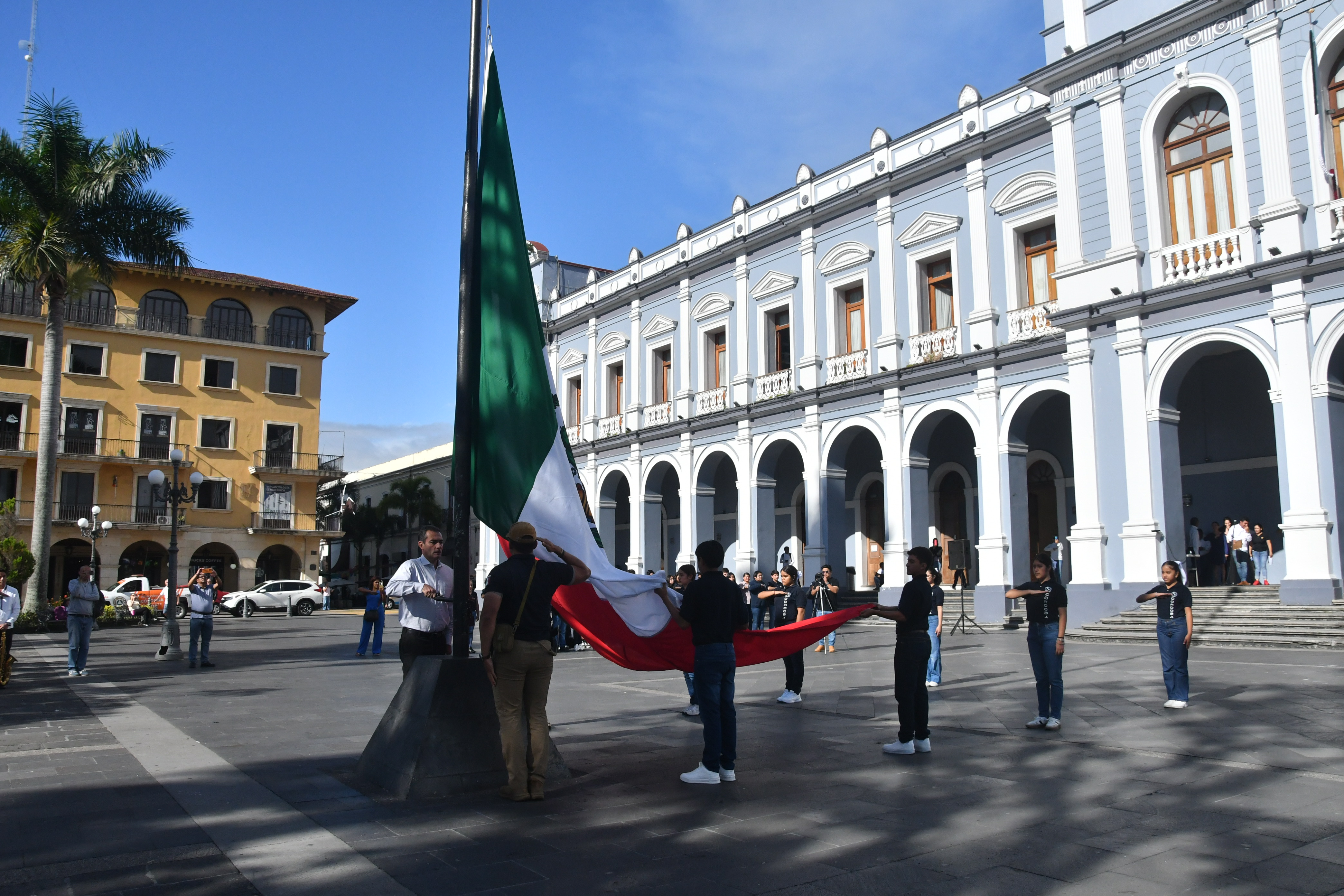 Tras el izamiento de la bandera a toda asta, la maestra Rocío Sarao dirigió el programa cívico en el que se entonaron las notas del Himno Nacional Mexicano y del Himno a Veracruz, acompañados por la Banda Municipal, realzando así la importancia de esta fecha histórica.
